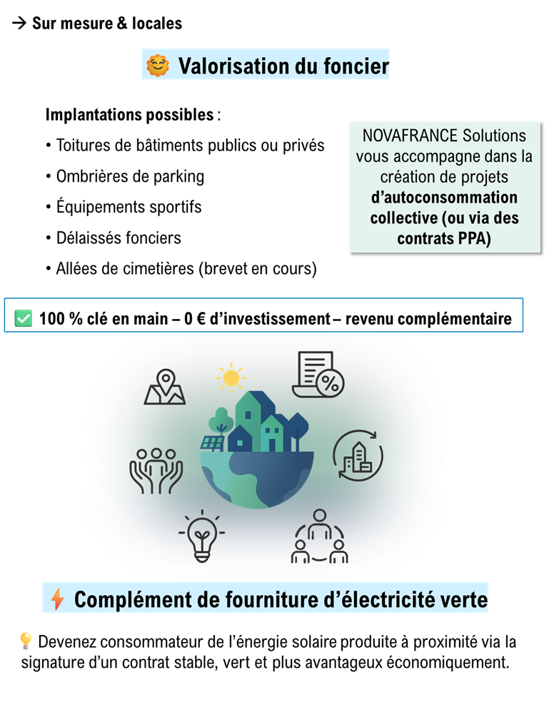 Grâce à NOVAFRANCE SOLUTIONS, vous avez accès à une solution clé en main, qui transforme les cimetières en des lieux plus accueillants et écologiques, tout en produisant une électricité propre, bénéfique pour la collectivité et/ou ses habitants.